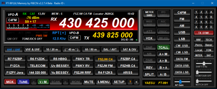 Spécifications•Couleurs écran synchronisées avec l'affichage du FT-991•Gestion mémorisation du CTCSS du DCS et DGID•Fenêtre de programmation des fréquences VFO-A, VFO-B , modes etc...•Nombreuses commandes du menu du FT-991•Meter, IPO, Wide/NAR, AGC, ATT, PROC, VOX, REV, contour, shift, notch etc...•126 boutons de mémoire•Libellé des boutons de sélection de groupes•Mémorisation rapide (fréquence dans le nom du bouton)•Mémorisation dans la mémoire du FT-991(A)•Affichage dBm et point S en test (cliquez sur dBm)•Sauvegarde et restauration du MENU SETUP FT-991(A)•Paramètrage du MENU SETUP•Sauvegarde et restauration des mémoires du FT-991(A)•Roulette de la souris pour changer la fréquence du VFO-A