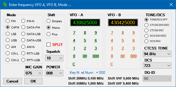 Entrée des paramètres•Fréquence VFO-A•Fréquence VFO-B•Mode•Shift & split•Niveau de squelch•POWER•MIC GAIN•TONE / DCS•DGID•Envoyé directement au FT-991